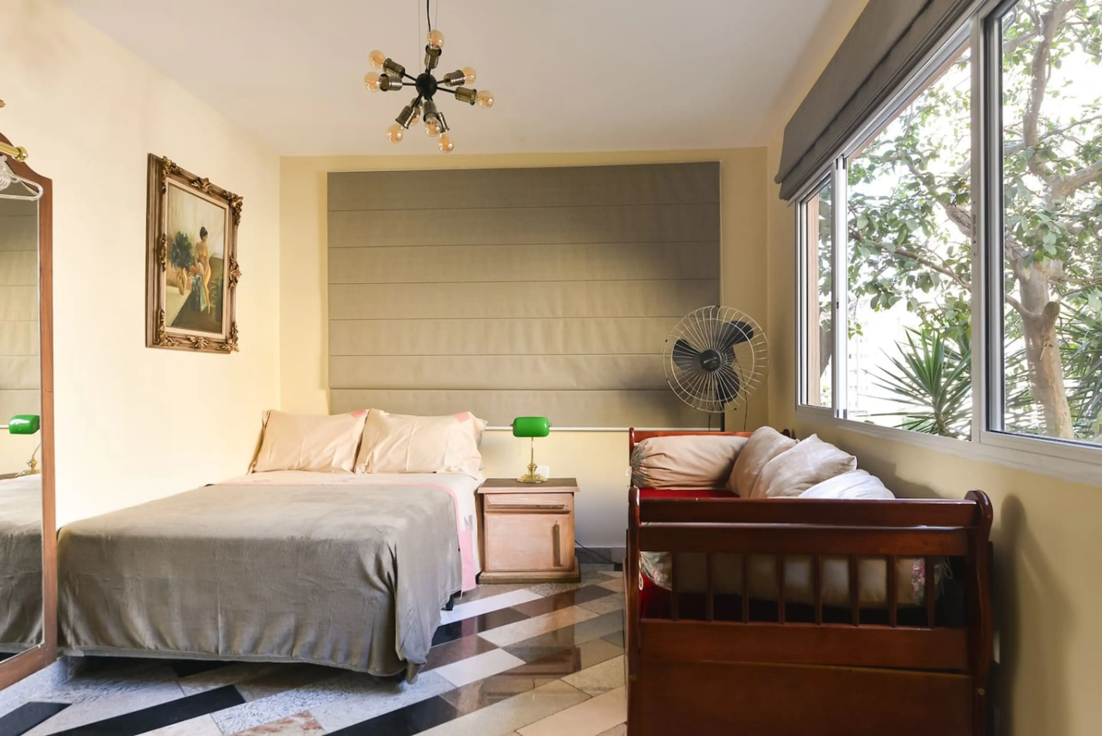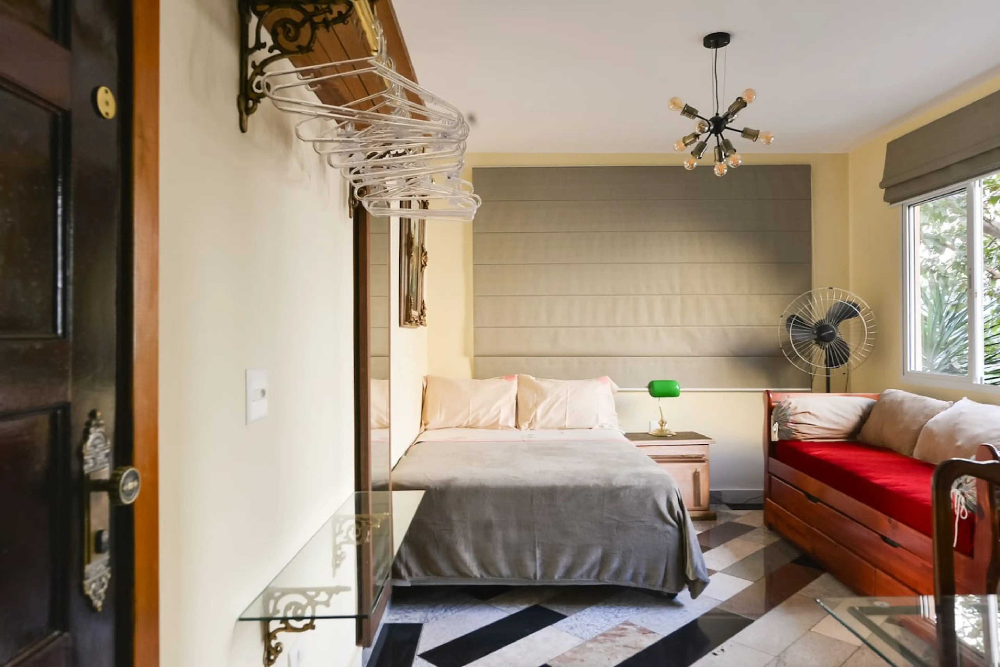 Quarto suíte acomoda até três pessoas. Cama de casal grande e uma de solteiro todas muito confortáveis, mesa para refeições/trabalho, cozinha compacta com pia, microondas, frigobar, utensílios básicos(pratos, talheres, copos e xícaras) e espelho grande. Estamos localizados em um lindo casarão a du...