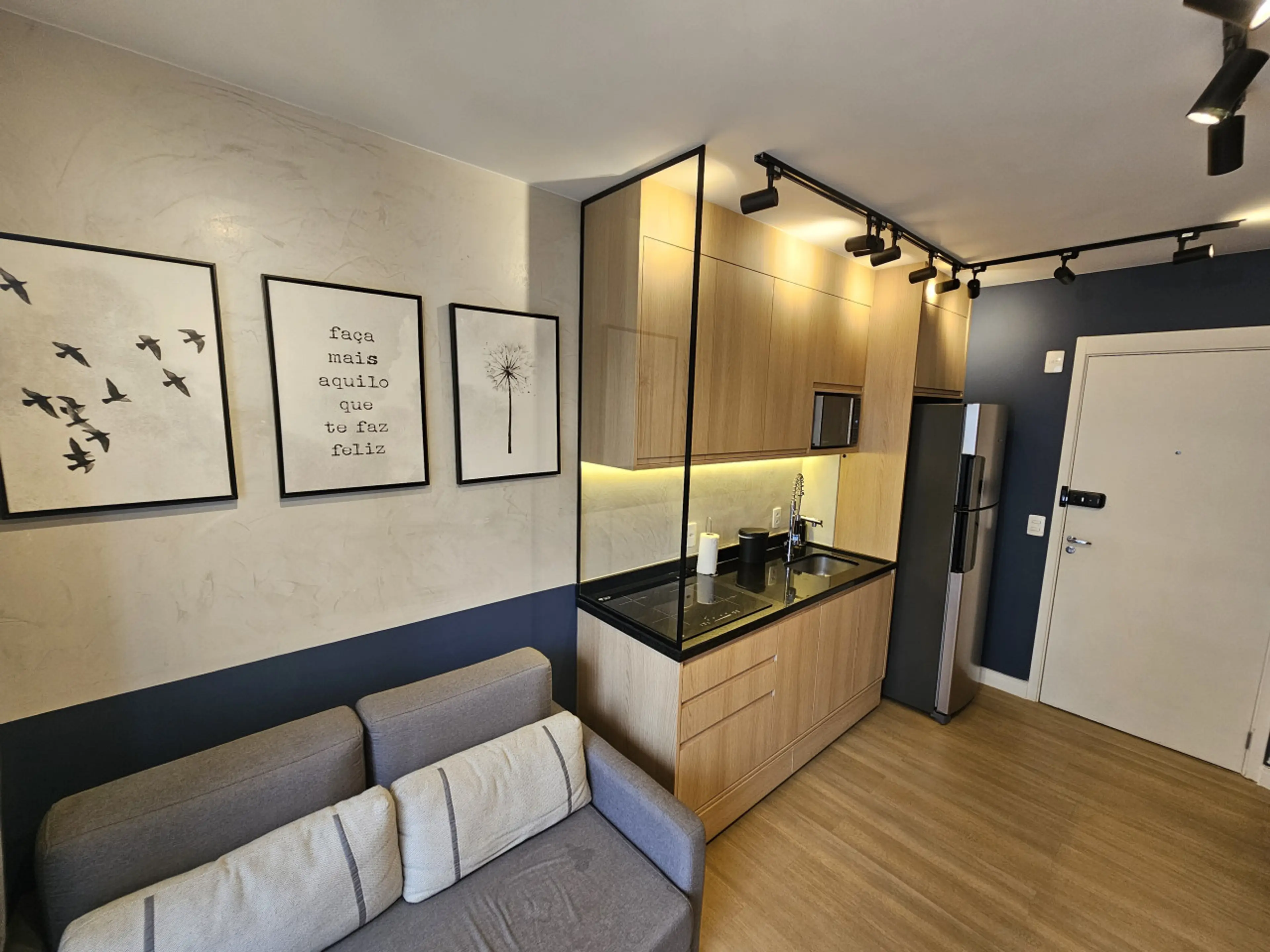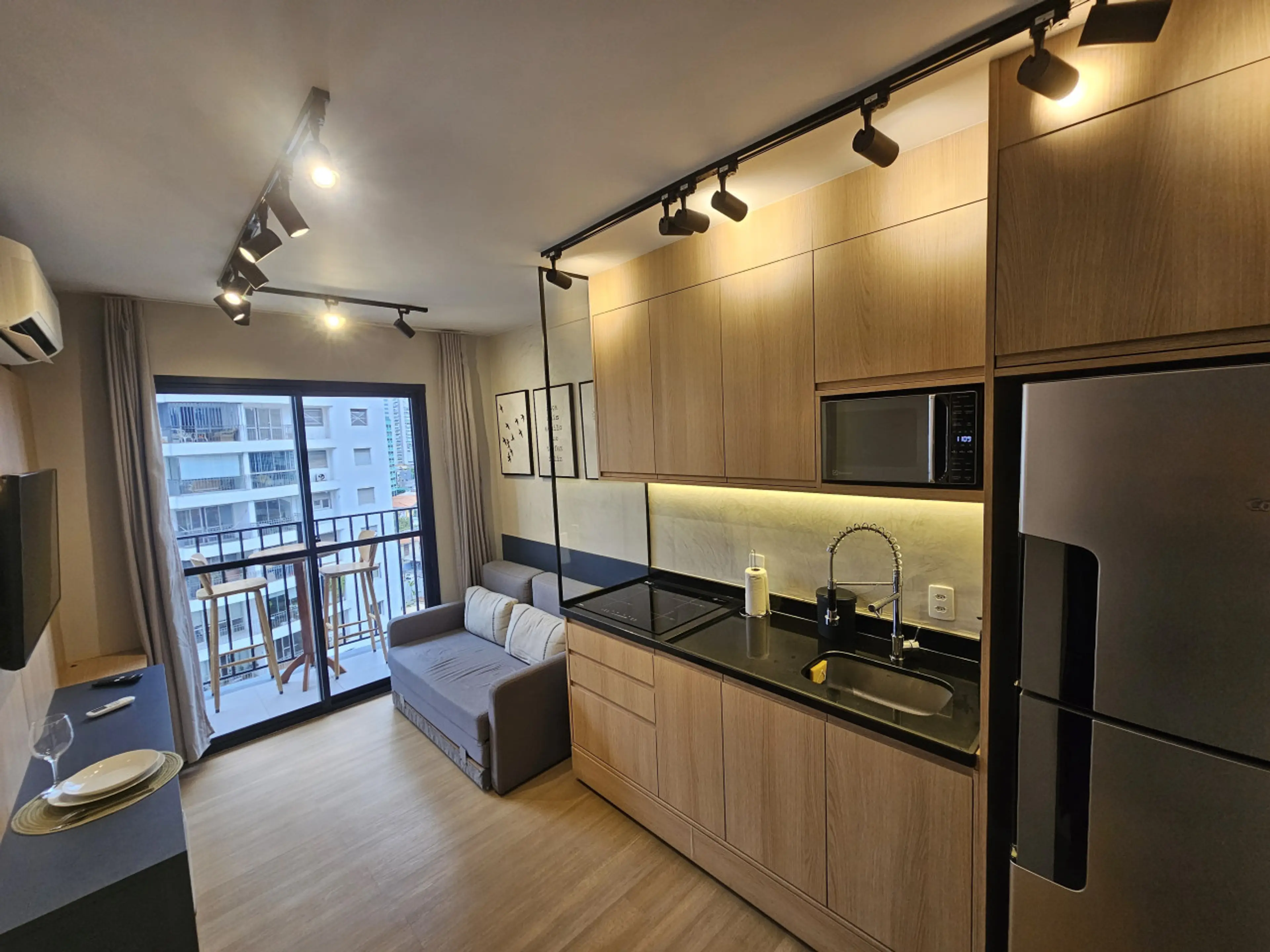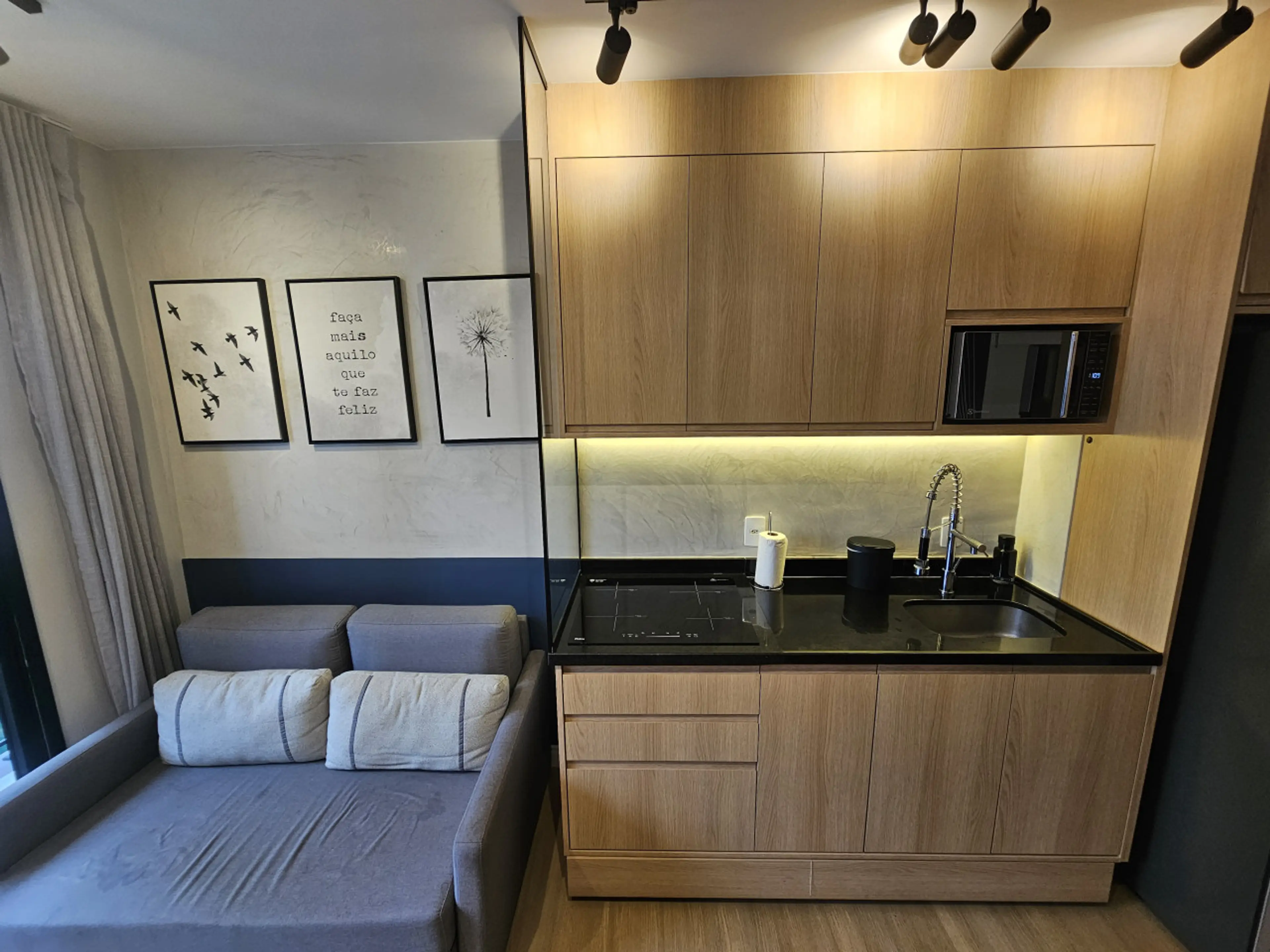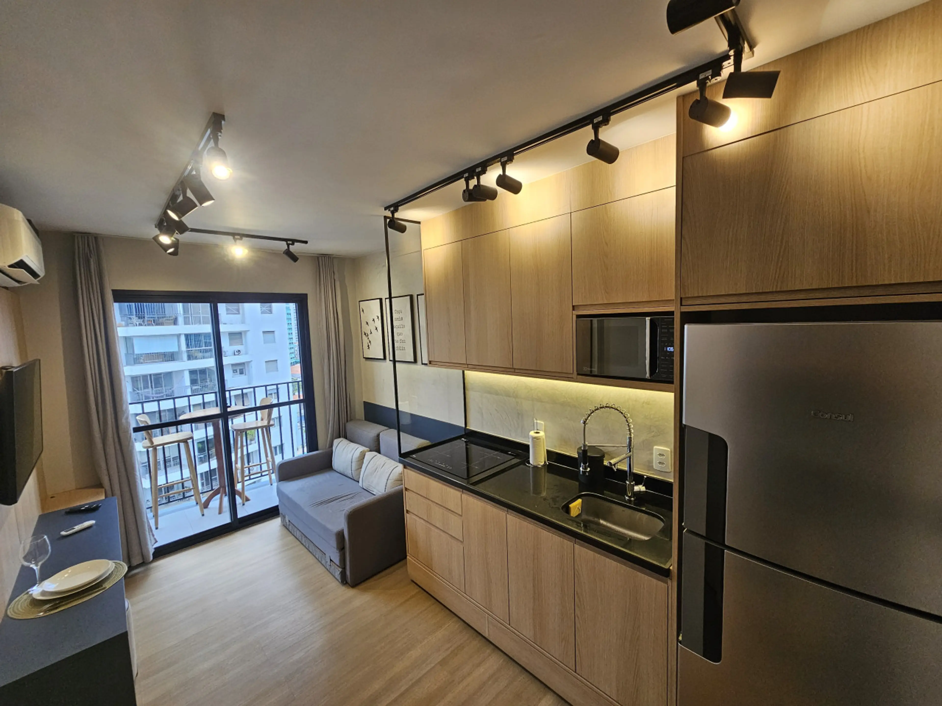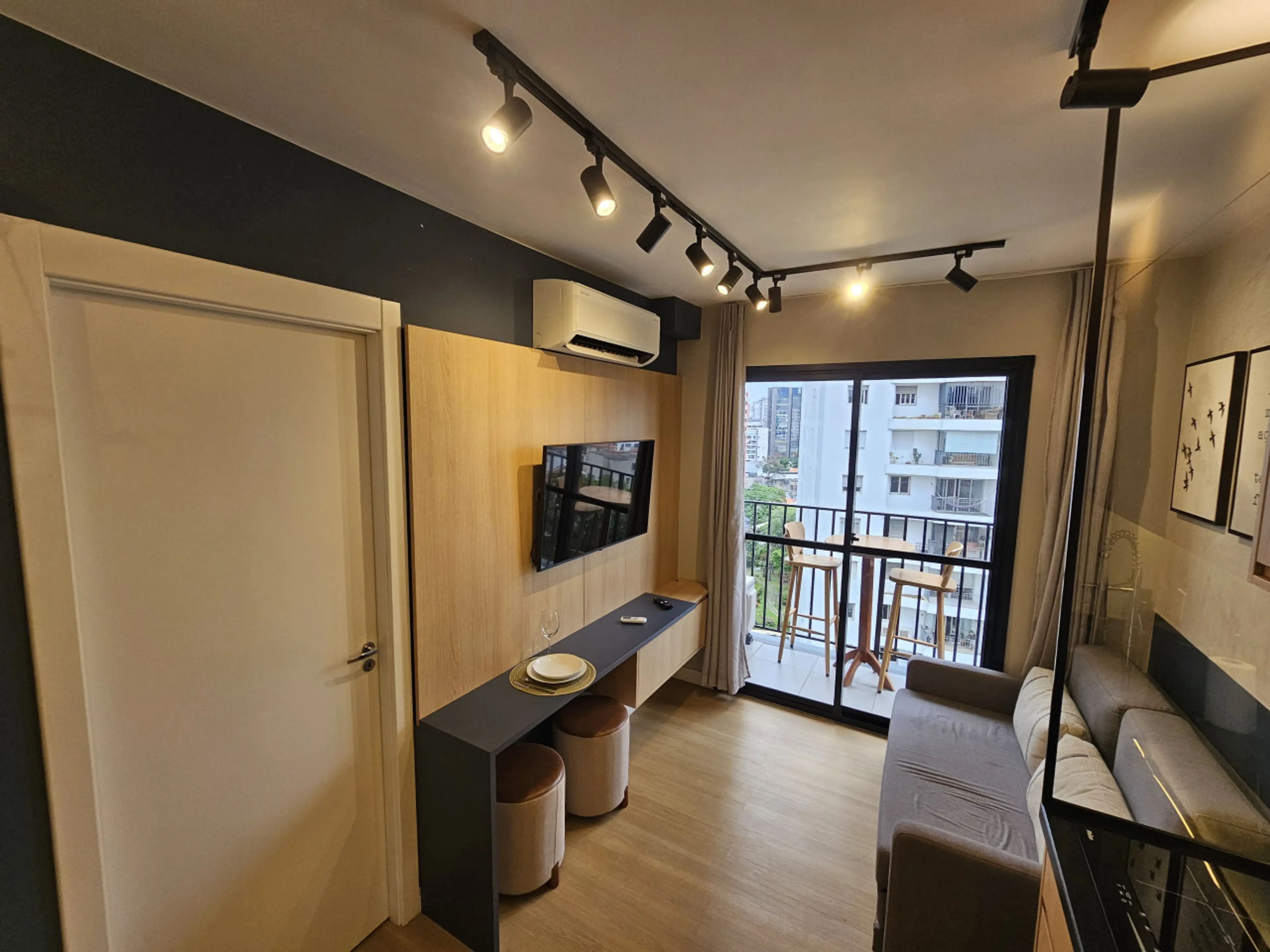Studio com varanda localizado em Moema dentro de condomínio com piscina, academia e lavanderia. O espaço é bem decorado e equipado com tudo que você precisa para ter uma estadia tranquila e confortável, incluindo smart TV e Wi-Fi rápido. Importante: O prédio não possui estacionamento!